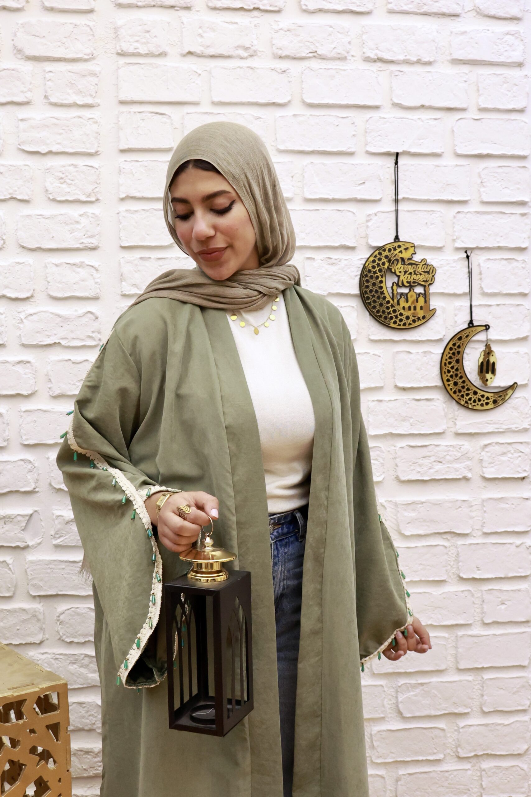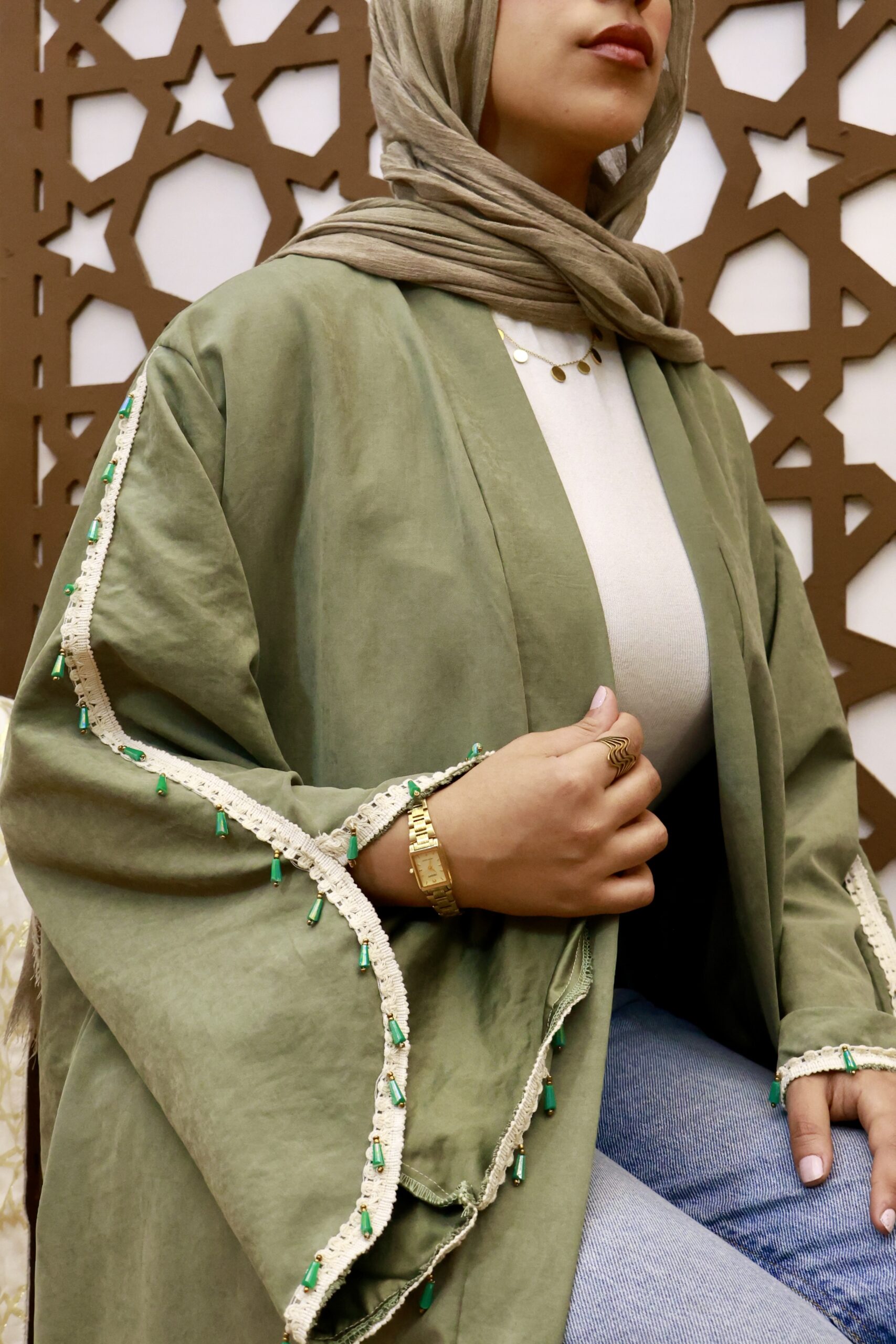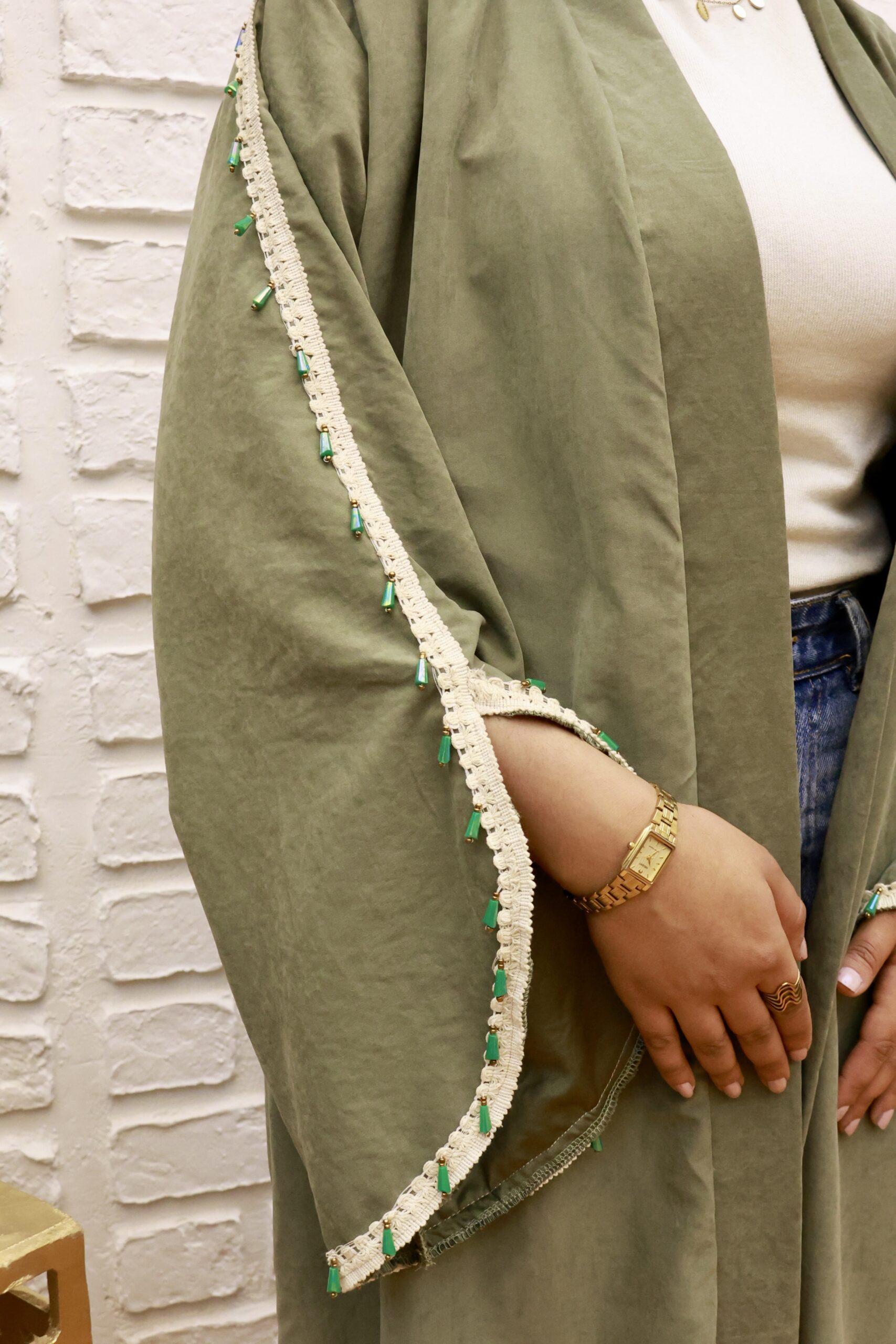 قفطان (Open Cardigan) بستايل بوهيمي شيك، مصنوع من خامة الكوبرا الإيطالي اللي بتتميز بنعومتها وانسيابيتها على الجسم، مع تفاصيل هاند ميد على الأكمام تخليكي مميزة في أي عزومة أو خروجة.
