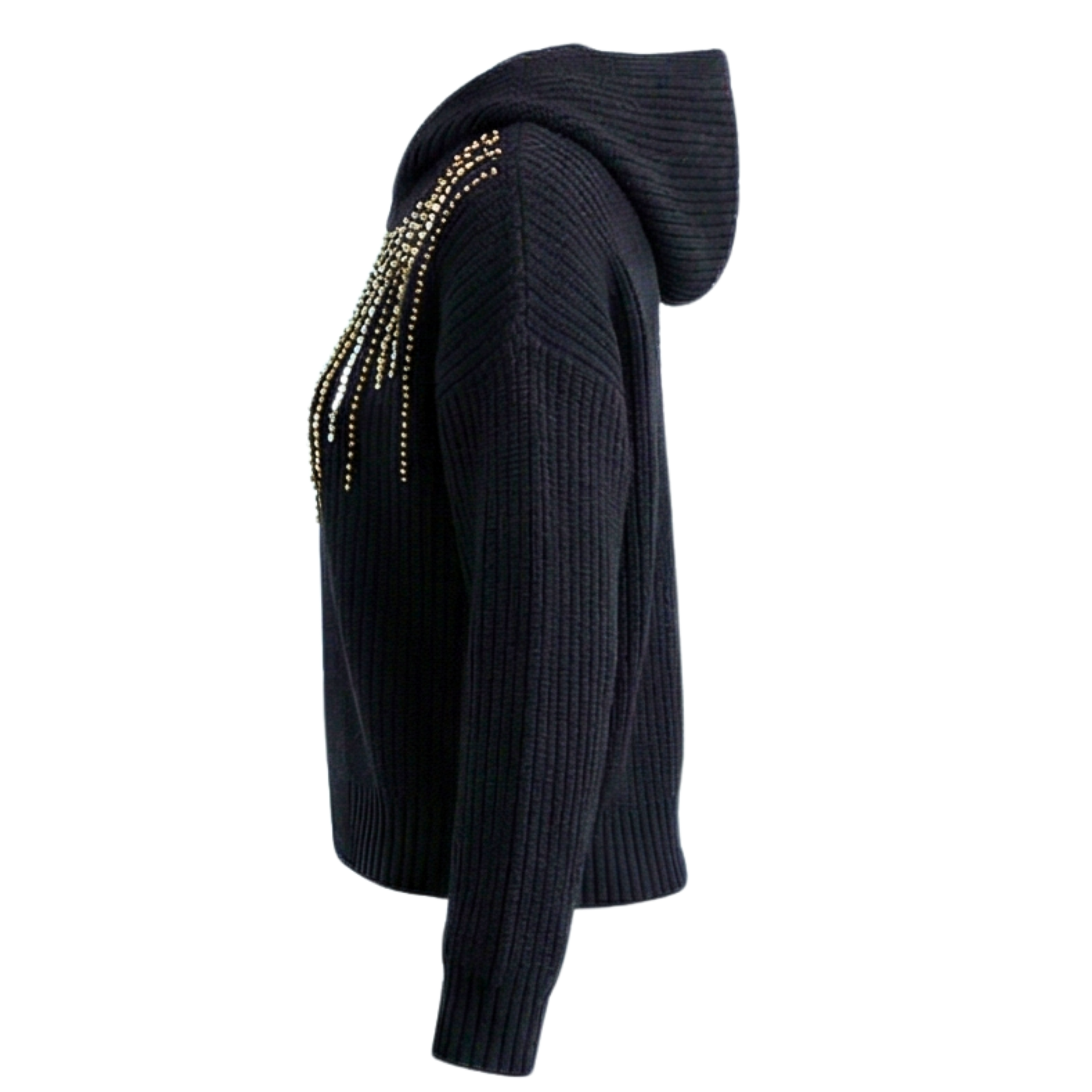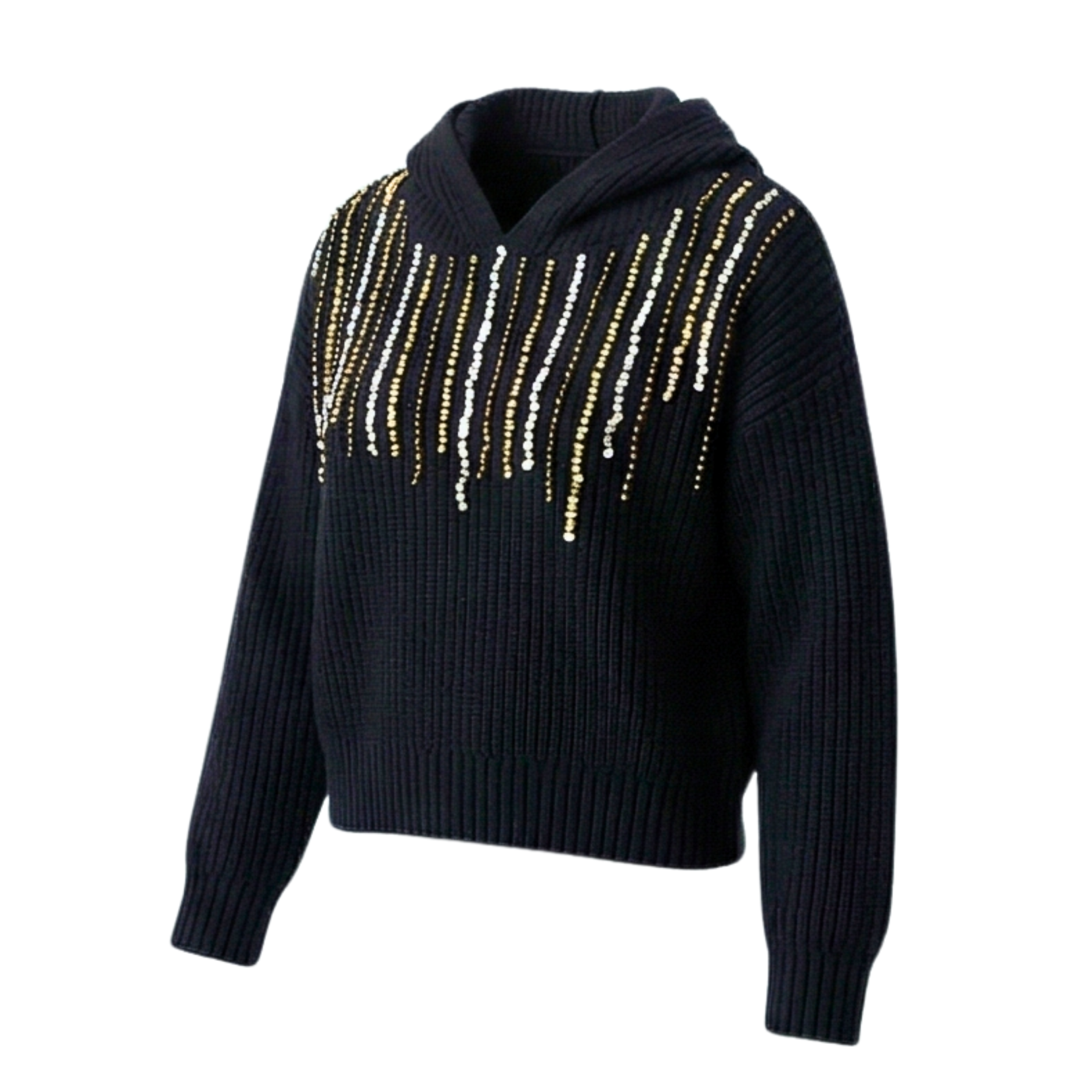 Shine bright with this Embellished Knit Hoodie. A perfect blend of cozy comfort and glamorous details.