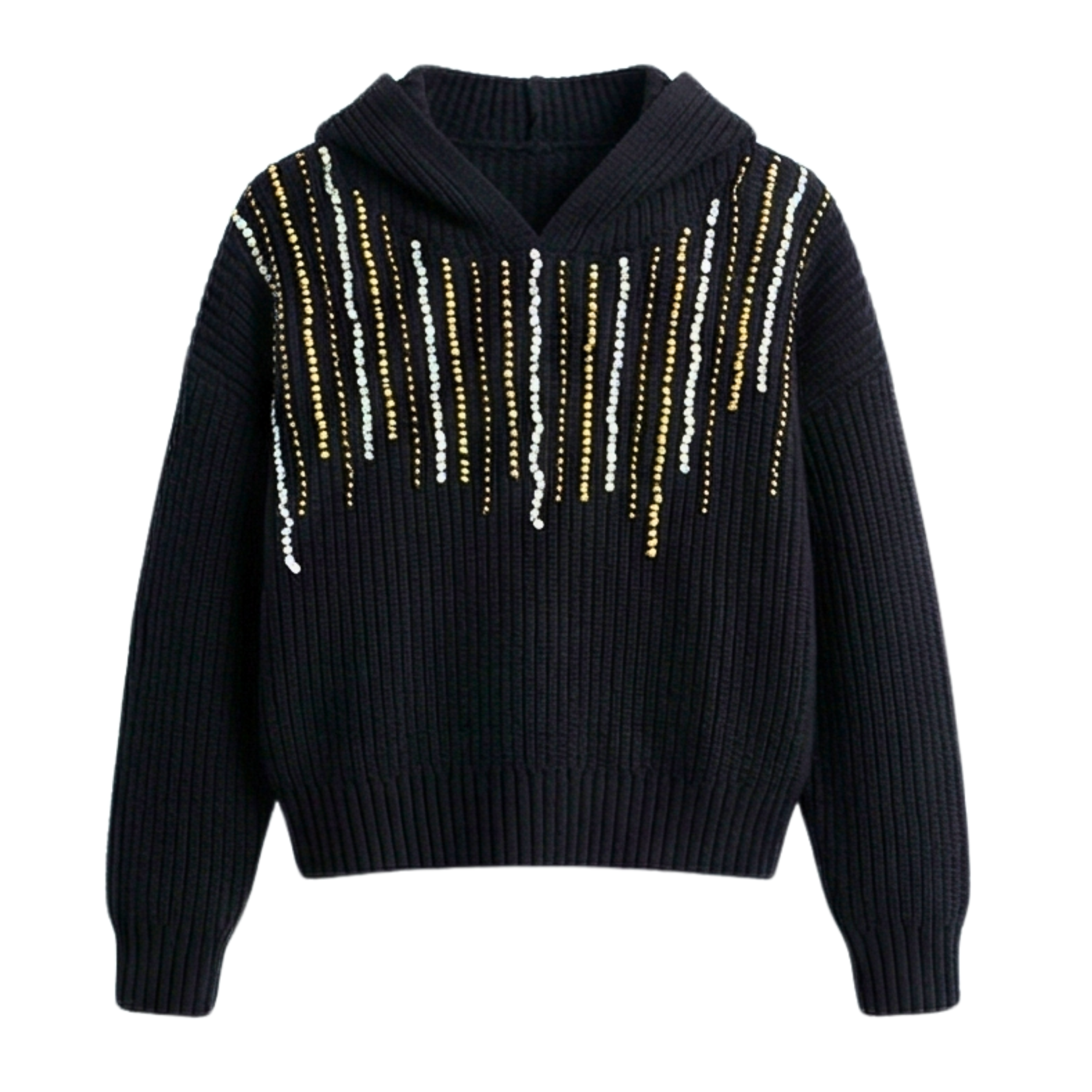 Add some sparkle to your winter days with this Embellished Ribbed Knit Hoodie. Featuring a cozy hood and cascading gold and silver bead detailing, this piece transforms a casual staple into a fashion statement.