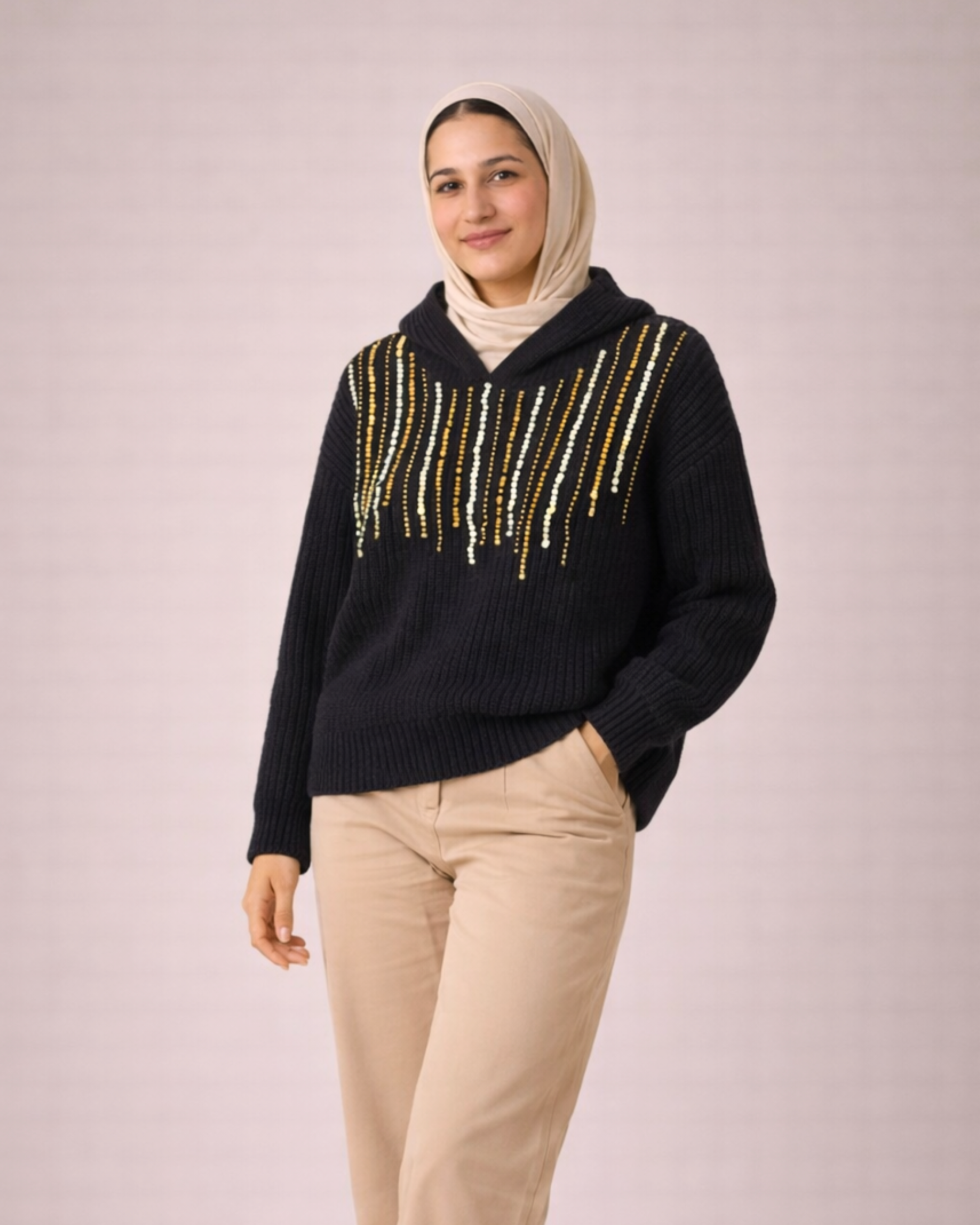 • التصميم: هودي (بلوفر بزعبوط) أسود، يتميز بتطريز خرز (Sequins/Beads) باللونين الذهبي والفضي ينسدل من الرقبة بشكل انسيابي وجذاب.
