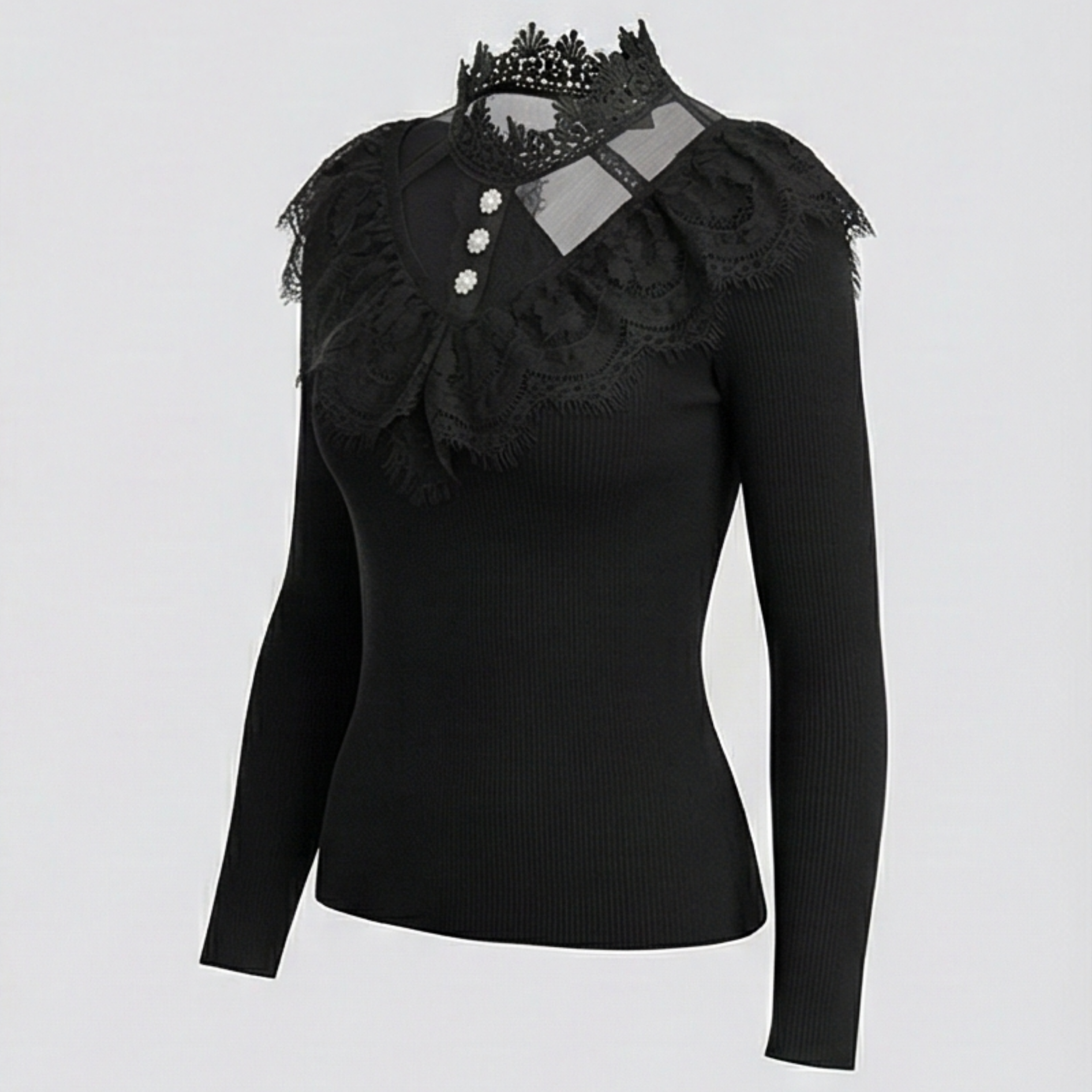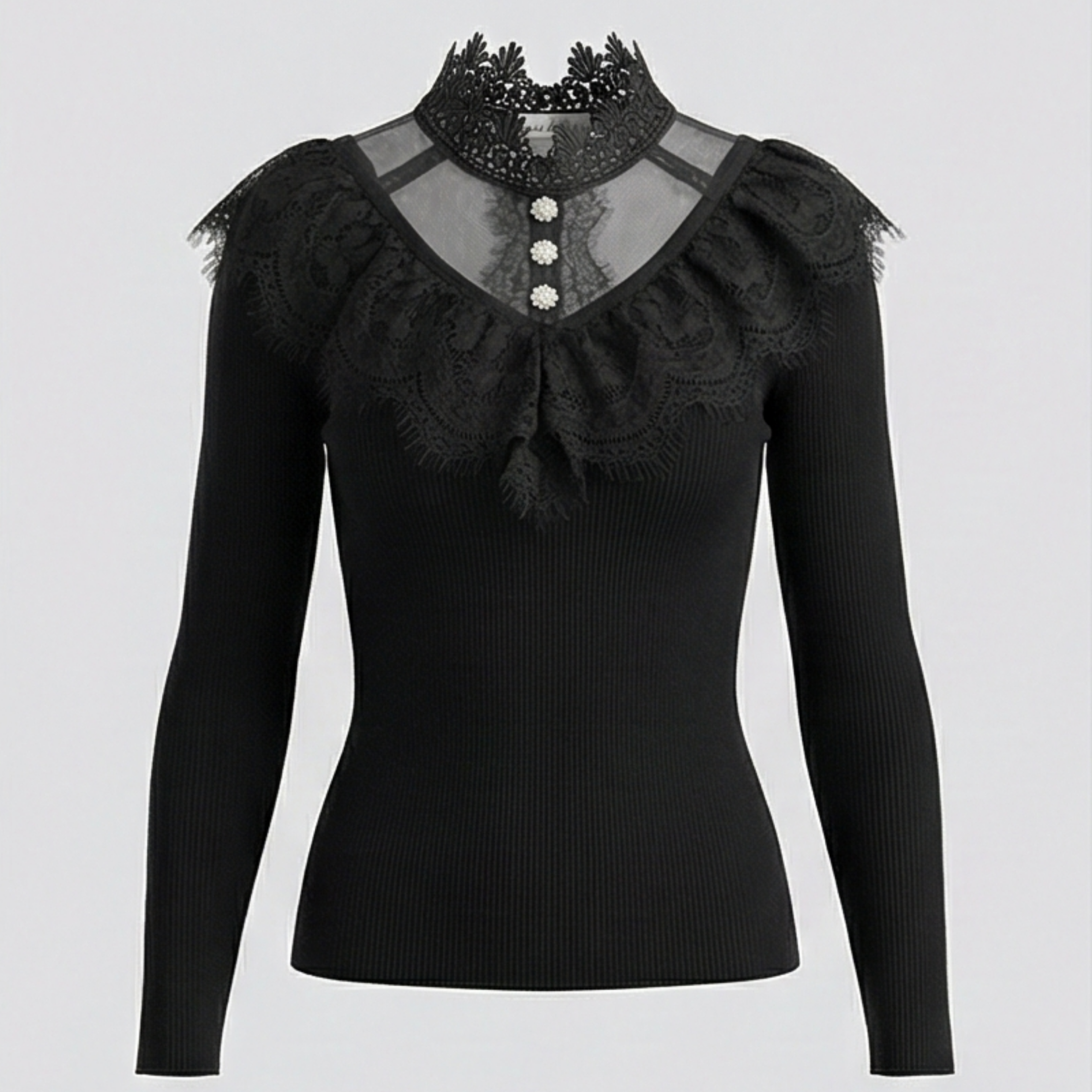 Make a statement with this Luxury Guipure Lace Blouse. Designed with intricate lace detailing along the neckline and chest, this piece offers a perfect blend of romantic femininity and modern elegance. The ribbed knit fabric ensures a flattering silhouette that hugs your curves comfortably.