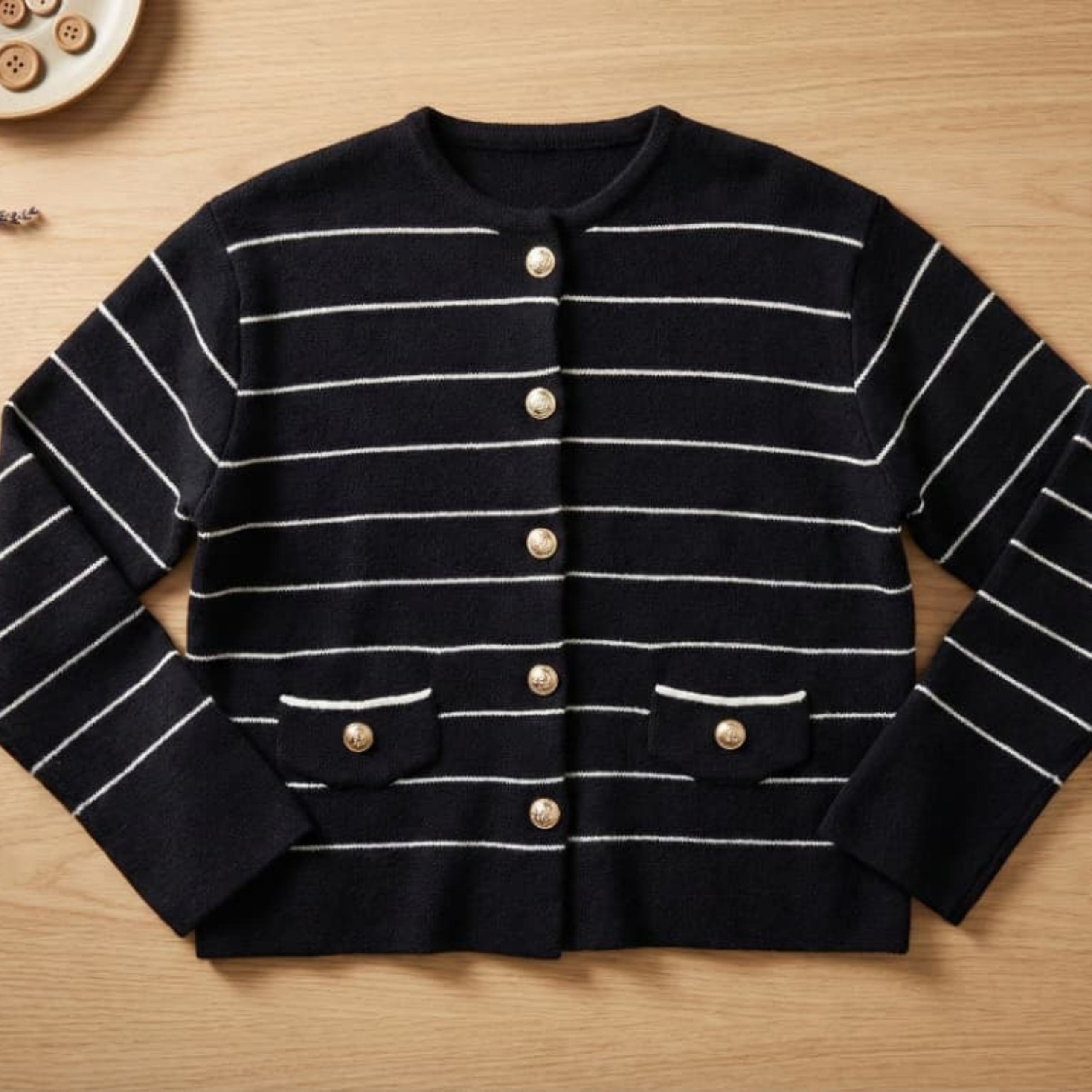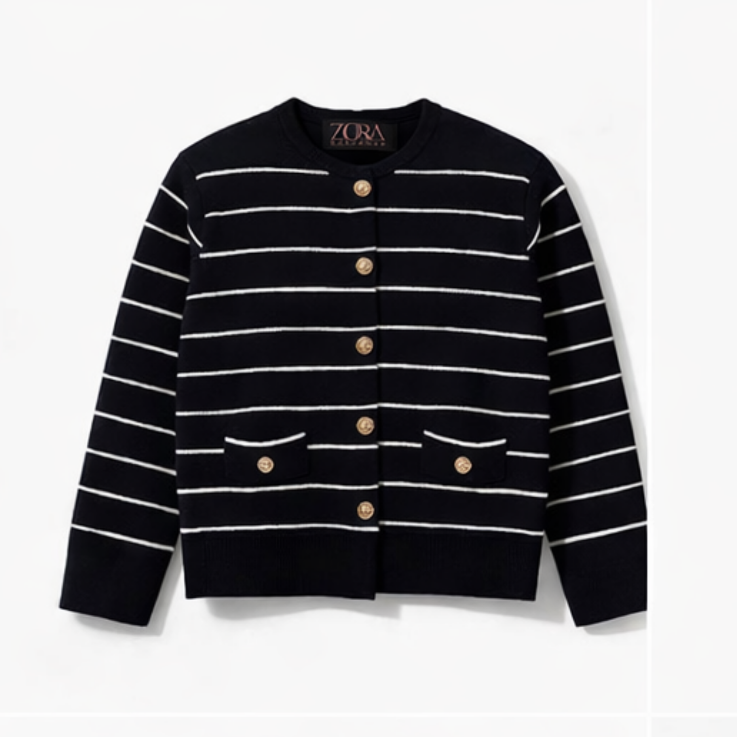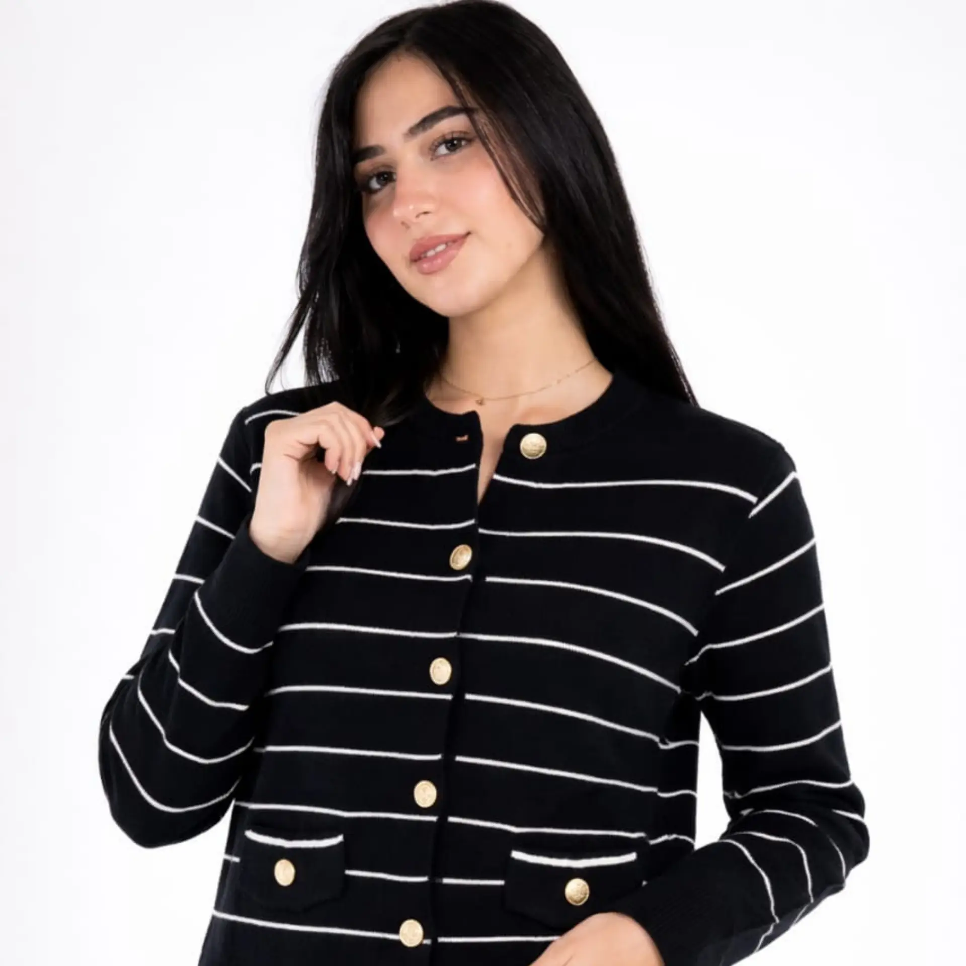 • التصميم: بلوفر/جاكيت تريكو مخطط (أبيض في أسود) مع أزرار ذهبية تضيف لمسة فخامة.