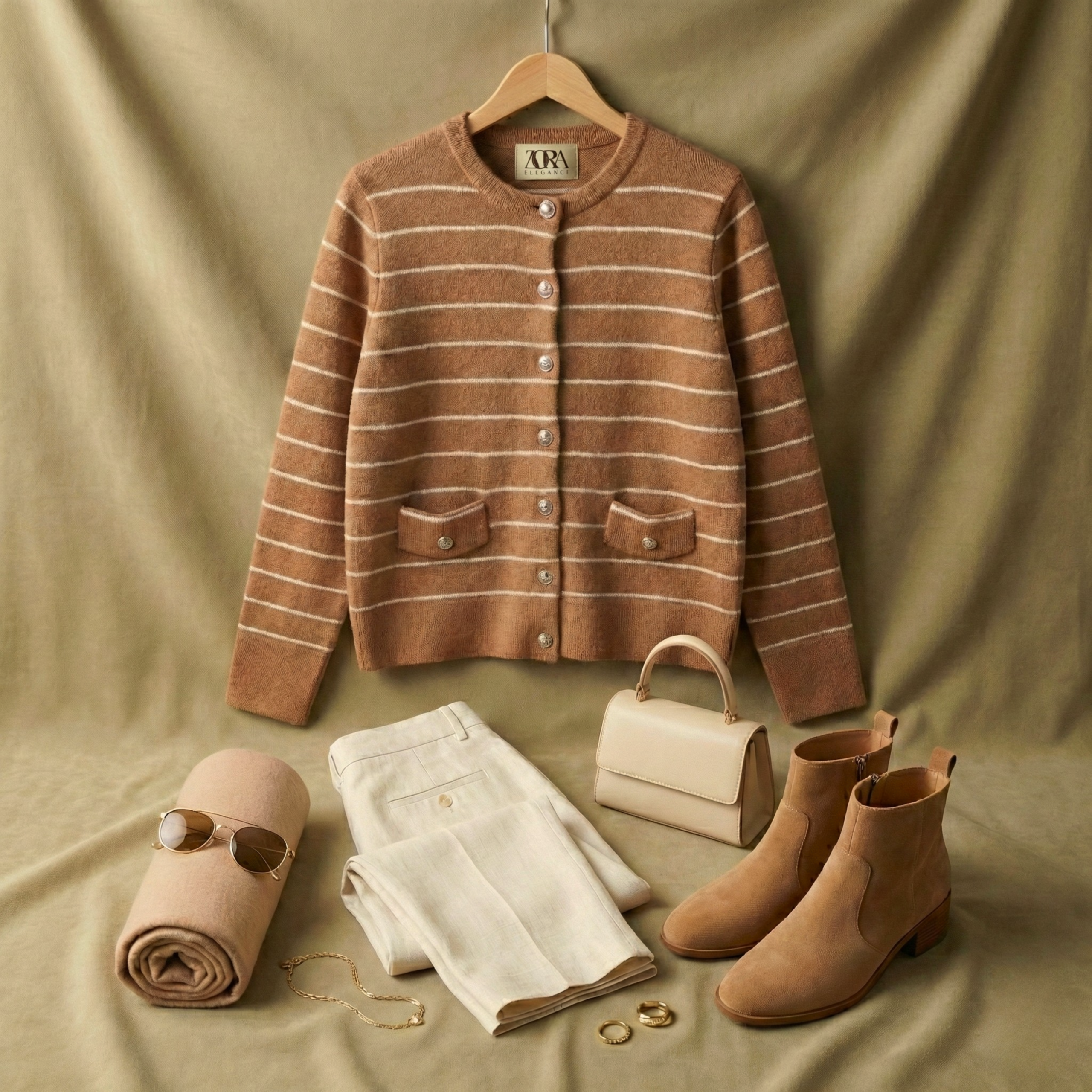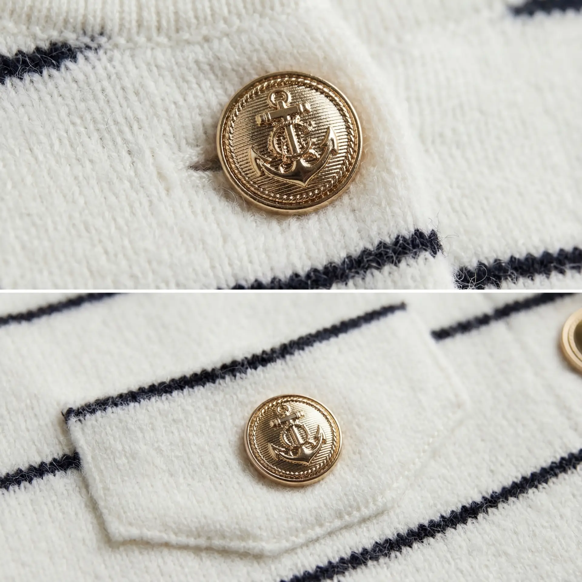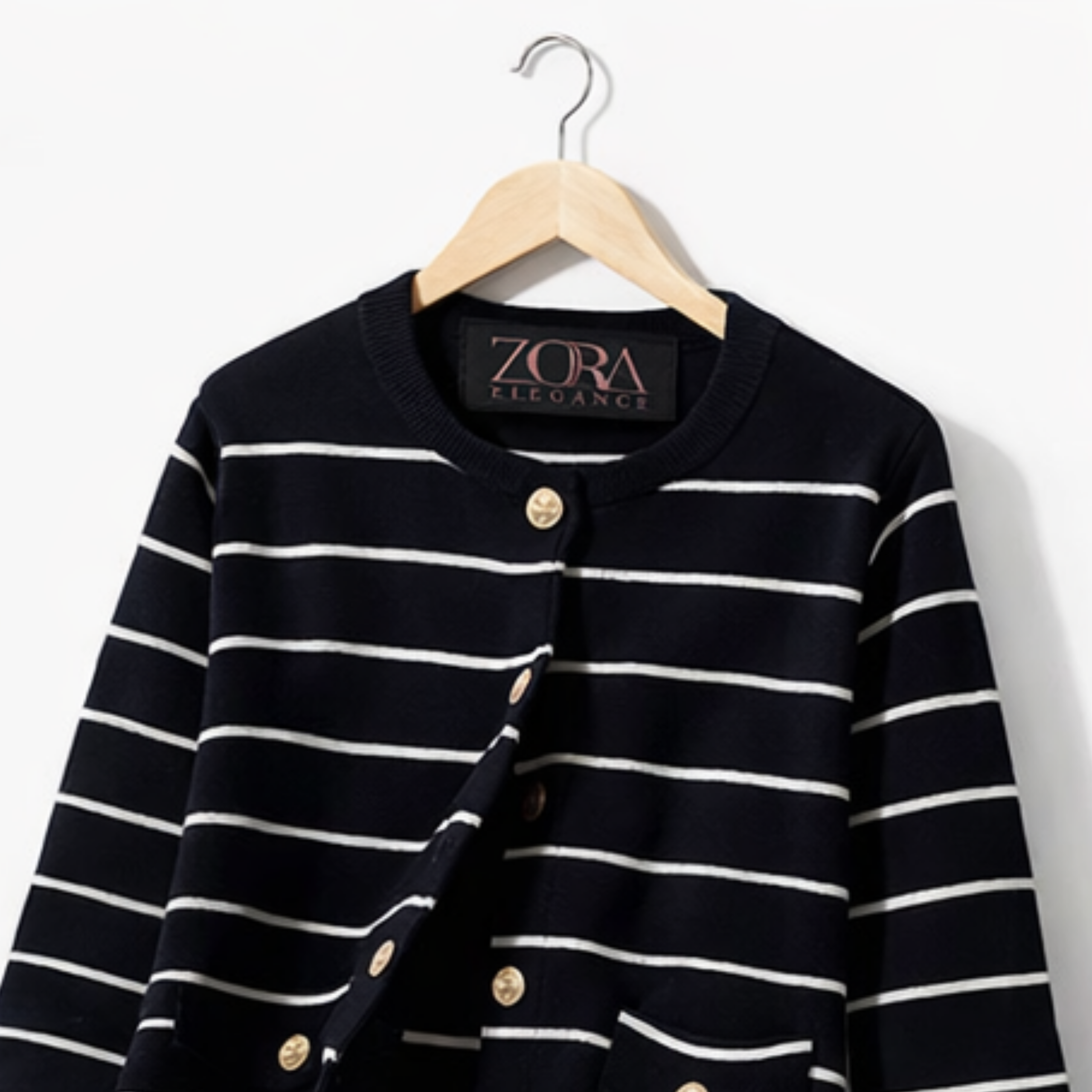 • التصميم: بلوفر/جاكيت تريكو مخطط (أبيض في أسود) مع أزرار ذهبية تضيف لمسة فخامة.